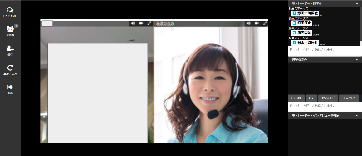 ご自身の音声や映像は反映されません。インタビュー対象者とモデレーターが映っている映像を見学できる状態です。