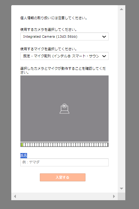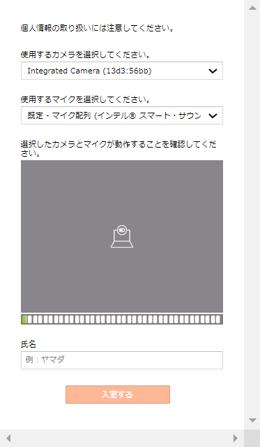 カメラ・マイクが正常作動するか確認をしたのち、名前を入力します。「入室」を押すとインタビュールームに入室となります。