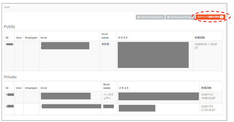 2.該当インタビューのIDをクリックし、ページ下部にある「全チャット履歴を削除」から全てを一括削除することが可能です。